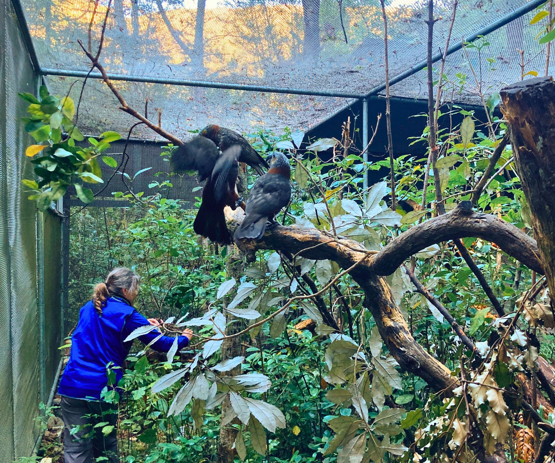 During their time in the aviary, the kākā were well attended by a team of sanctuary volunteers, Natureland staff, and Brook Waimārama Sanctuary staff. The busy work included a morning and an afternoon shift where water is replenished, feeding stations cleaned and filled, droppings are scrubbed, food items poked onto branches, and enrichment in the form of rotten logs, branches, and native berries added.