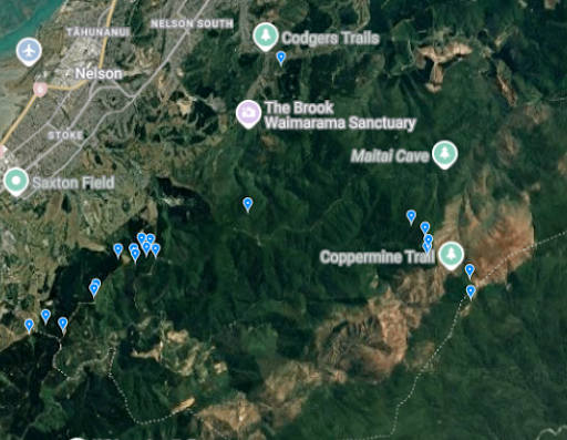 You can see that there are two distinct groups of recordings: one grouping in the forestry at Marsden Valley, and one grouping around Dun Mountain and Wooded Peak. This is a species that used to be common right down to coastal Nelson but has become restricted to the low-predator-density forestry and upland forests. There are, however, two outlier observations — one right down by Brook Street and one inside the Sanctuary on Falcon Spur. This can be explained by the behaviour of the species. This species forms transient flocks that include many creepers and are sometimes mixed with species like kākāriki. They have not yet established themselves in the Sanctuary, probably due to sheer bad luck. Hopefully, over time, we may observe a takeover. Better yet, if aerially dropped 1080 (a biodegradable toxin used for predator control) was used outside the Sanctuary, the outside creeper populations would produce more offspring that would be more likely to disperse into the Sanctuary. This is a species that would otherwise be impossible to reintroduce. All of this information could be gleaned from sitting at my computer. The only thing that was needed was the observations (several of which are mine).