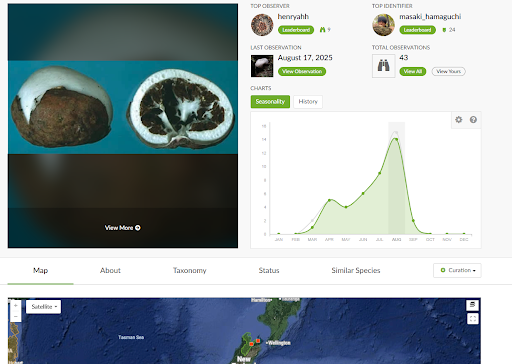 Here is the page for the Fischer’s egg fungus, a critically threatened species that is common at the Sanctuary. You can see when it is most often observed, its distribution, its taxonomy and threat status, as well as the Wikipedia article associated with the species. Each time you add a new observation, others can use that distributional, phenological (timing), and other metadata to expand the knowledge of how and where this organism lives. More and more recently, iNaturalist data is being used in scientific papers and revisions of species’ threat statuses.