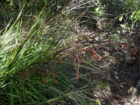 First of all, Gahnia is a common large grass-like sedge that grows within the Sanctuary and is very distinctive from pampas and toetoe. It has drooping seed heads with seeds that grow on stringy structures with leathery black sheaths. These differ from the characteristic fluffy tufts of the pampas and toetoe. The seeds are large, brown and hard. The plants have long cutty leaves and are a dark glossy green.