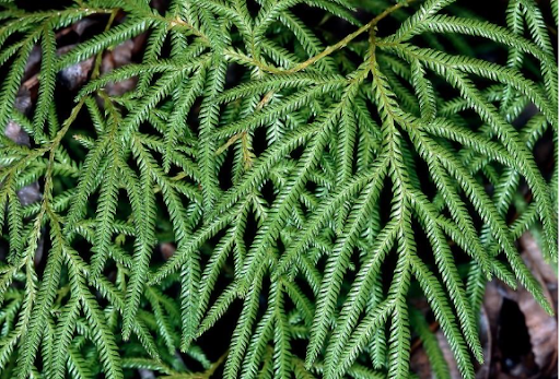 The native clubmoss appears flat and somewhat rigid, apart from its sporophyll (reproductive structure), which becomes more tubular. It also grows at diagonal angles across the ground.
