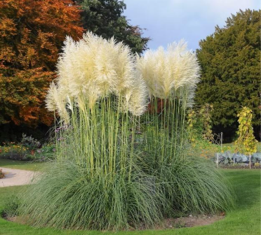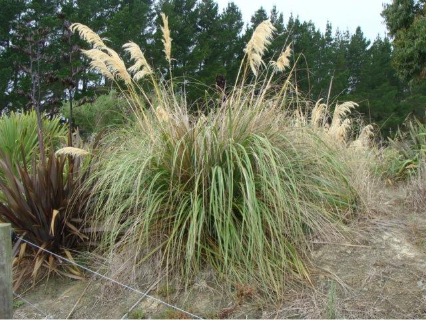 Pampas is a much larger, dense-growing thick grass reaching a height of up to 5 metres when mature. Pampas leaves have one prominent midrib and very sharp edges. They often have a large mat of dead leaves that curl up and look like wood shavings at the base. The flowers and stems stick straight up and are creamy to pink, sometimes purple, in colour with dense white fluffy seed. They start flowering in autumn. If you bend the leaves they snap, while toetoe and Gahnia are tough.