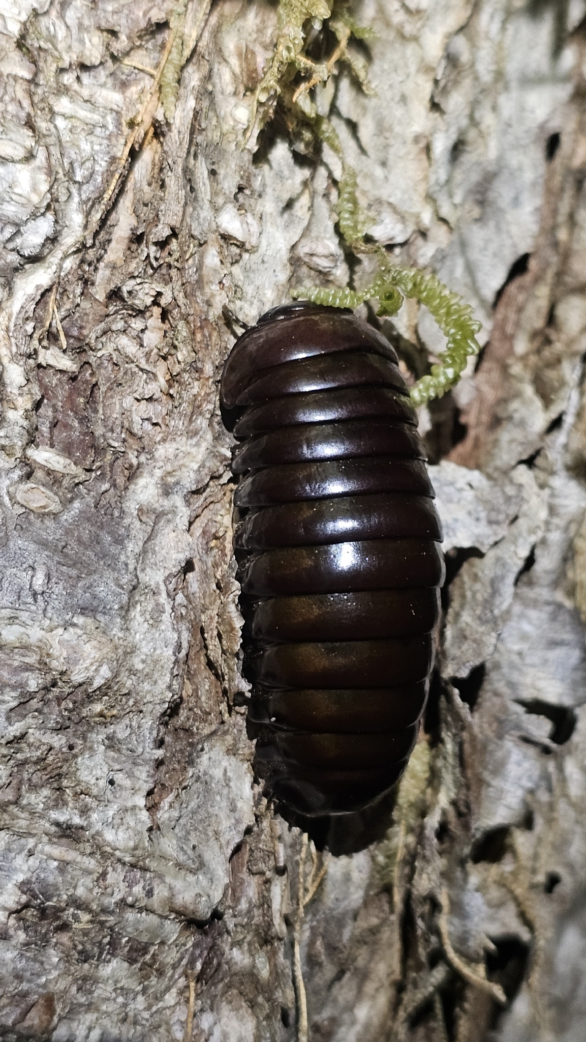 These compact millipedes are distinguished by their ability to roll up into a near-perfect ball (called conglobation), hiding head and legs entirely beneath glossy plates. Each segment (tergite) overlaps the next, forming a protective shield. Colours vary from dark brown to black-shiny, with adult sizes comparable to a large marble or cherry.