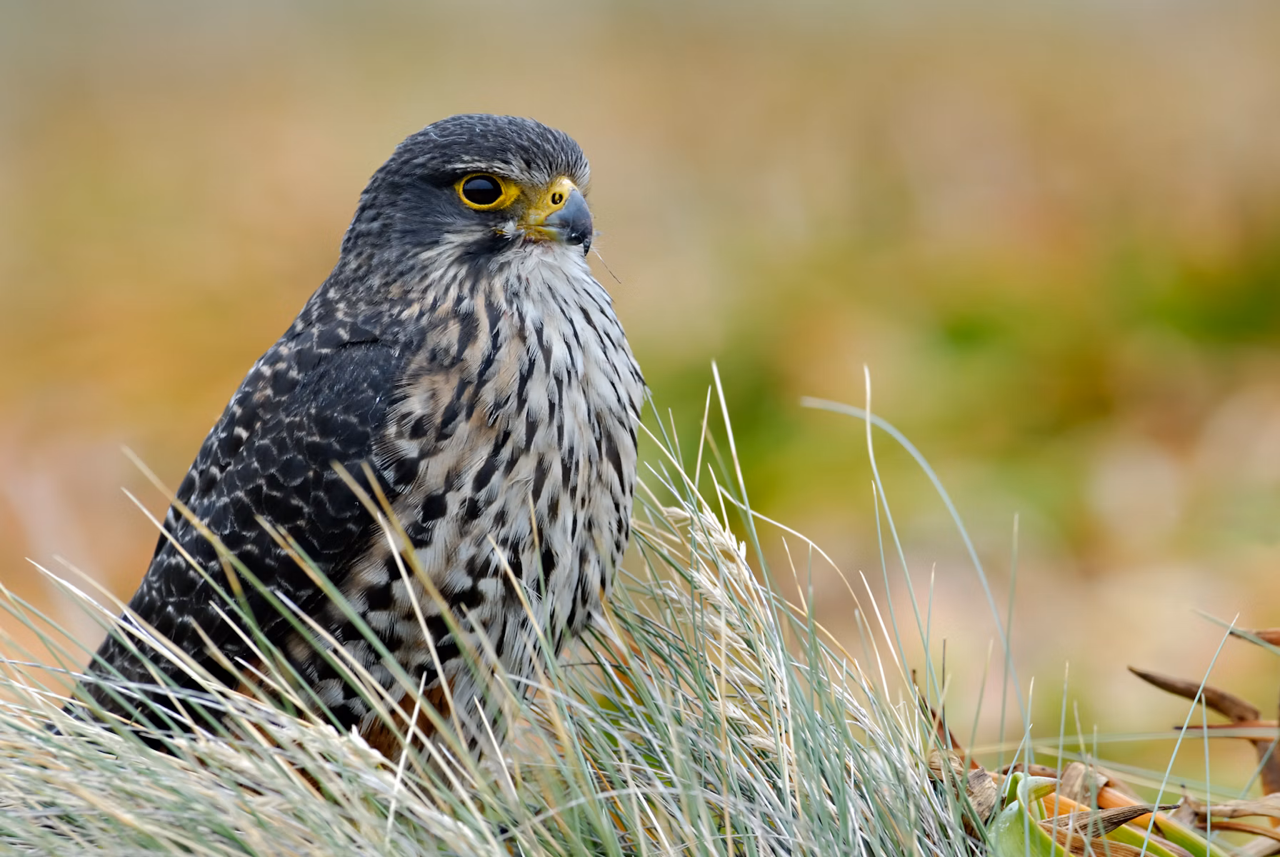 Kārearea have brilliant checkered markings, with a dark brown upperside and pale underparts. The plumage around the legs is a dark orange. Adults have bright yellow legs and skin around the beak and eyes. The male is much smaller than the female, a clear example of sexual dimorphism.