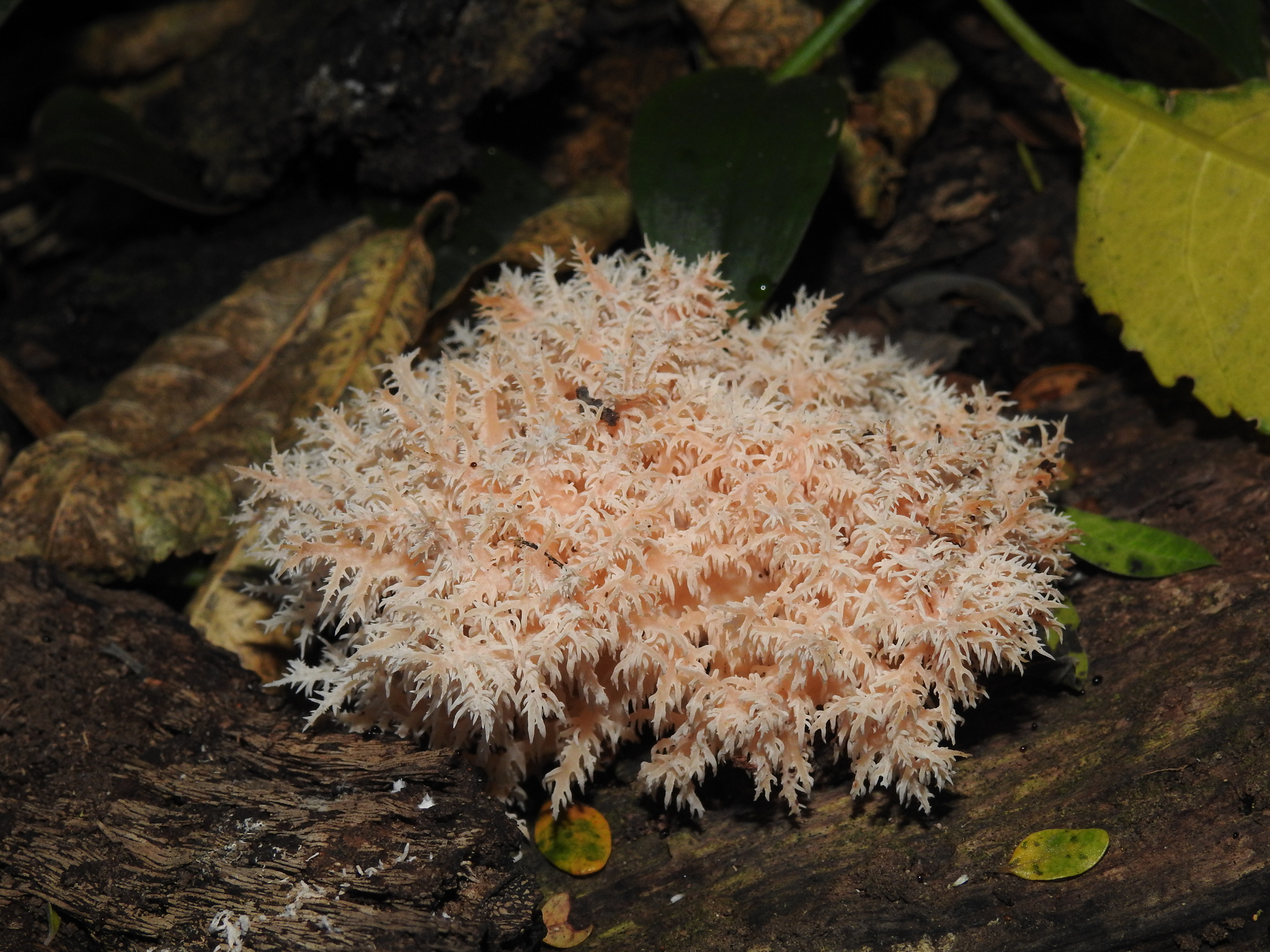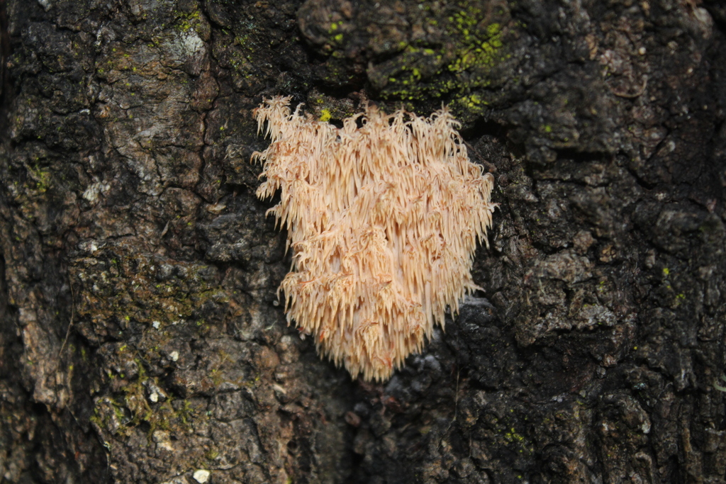 This fungus features a cascade of long, soft spines (up to 250 mm long) hanging from dead wood, with colour ranging from white to cream, sometimes turning pink as it ages. The spines bear spores on their surface. Sizes vary from around 30 mm up to 250 mm. Its unique form distinguishes it from other fungi, making it a memorable sight for visitors and photographers alike.