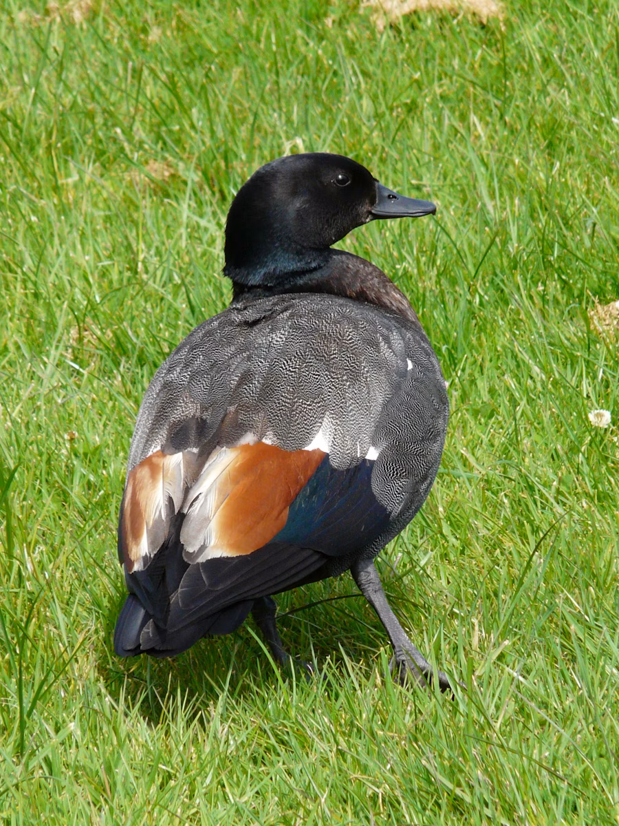 Pūtangitangi are large shelducks with long necks and a strong, honking voice. Females have chestnut bodies and white heads, while males are darker with iridescent green-black plumage and chestnut flanks. Their sexual dimorphism makes them one of the easiest native waterfowl to identify. Both sexes emit distinct calls — the female’s sharp zeek-zeek and the male’s deeper zonk-zonk.
